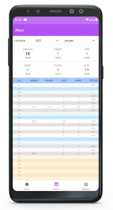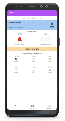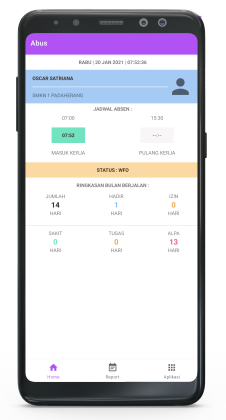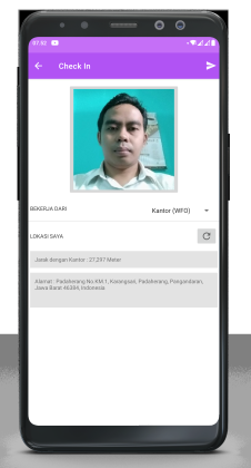 Aplikasi Absensi Android dengan fitur GPS (Lokasi) dan Foto Selfie. Sudah terdapat fitur WFH (work From Home) dan WFO (Work From Office).