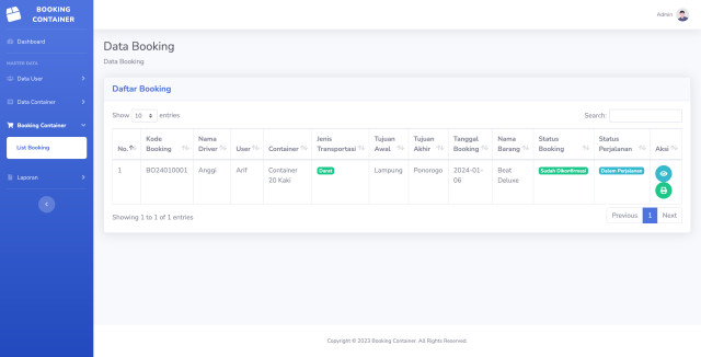 - Dashboard (Statistik Total Booking, Total User, Booking Dalam Perjalanan, Booking Selesai)