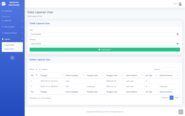 Booking Container adalah Aplikasi yang digunakan untuk membooking container yang akan dikirimkan ke pelanggan. aplikasi ini dibuat dengan menggunakan bahasa pemrograman PHP dan database MySQL. aplikasi ini sudah responsive dan sudah ada fitur tracking, laporan, dan validasi booking. aplikasi ini dibuat dengan menggunakan framework codeigniter 3 dan template sb admin 2.