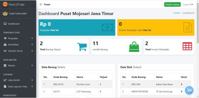 - Dashboard yang memberikan informasi barang terjual, jumlah barang, customer, Data invoice, data barang terlaris dan data stok terkecil