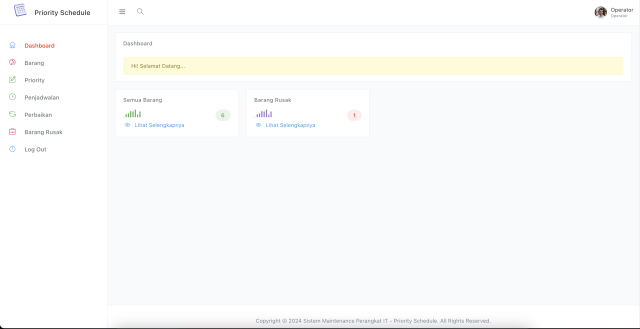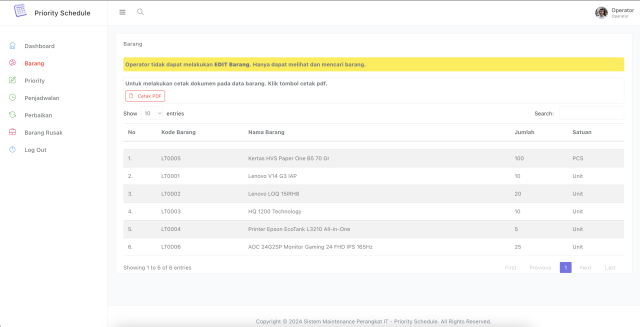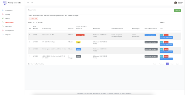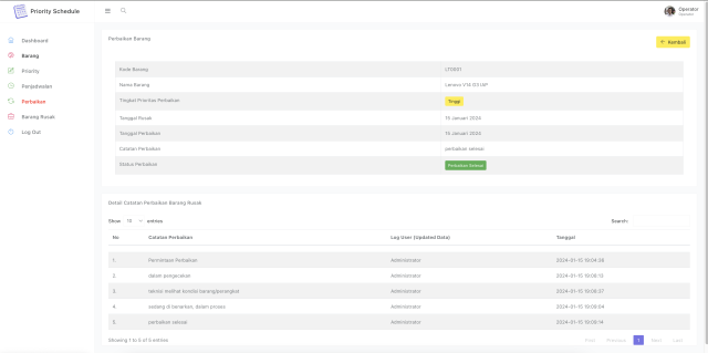 - terdapat fitur list PRIORITY SCHEDULE yang digunakan untuk melihat barang mana yang harus diperbaiki terlebih dahulu.