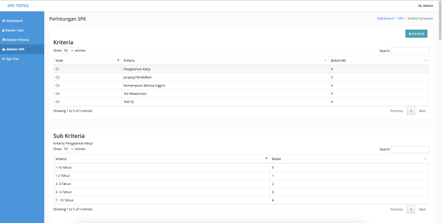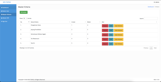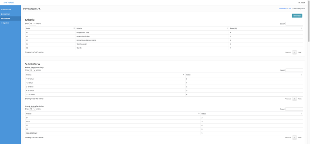 - Master Kriteria (Sudah Dinamis, Menyesuaikan dengan Kriteria yang diinputkan)