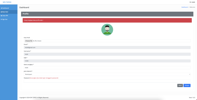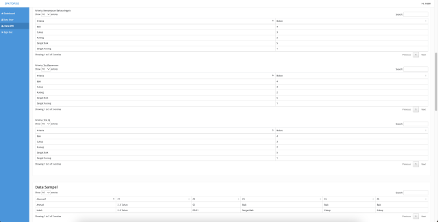 - Data SPK (terdiri dari Data Kriteria, Data Sub Kriteria, Data Alternatif, Data Sample, Data Hasil SPK/Ranking)