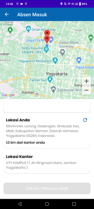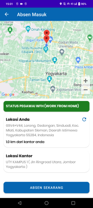 - Proses presensi diukur dengan jarak antar lokasi kantor dan device pegawai, jika memenuhi syarat maka pegawai dapat melakukan presensi