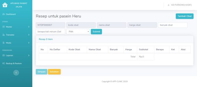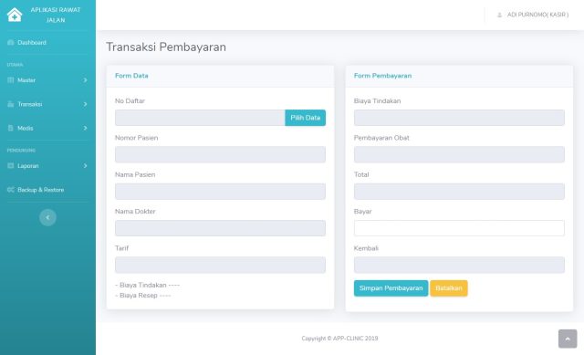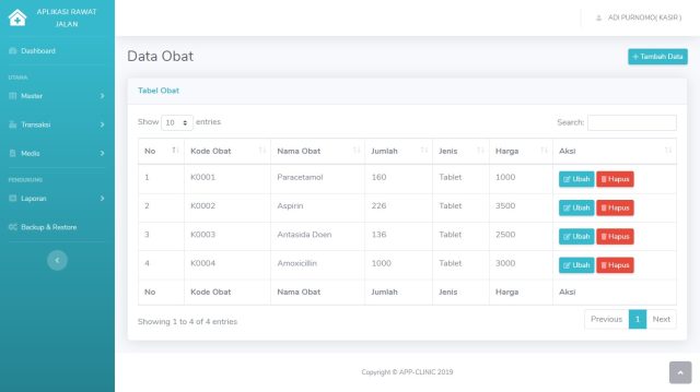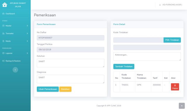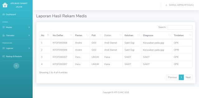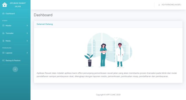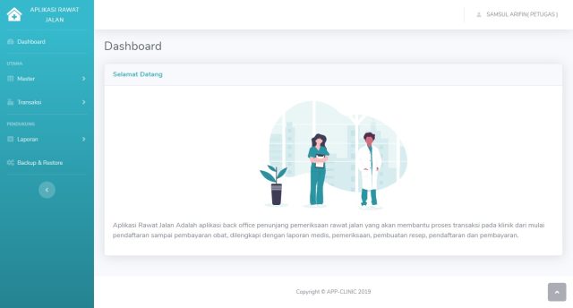 Aplikasi Rawat Jalan Adalah aplikasi back office penunjang pemeriksaan rawat jalan yang akan membantu proses transaksi pada klinik dari mulai pendaftaran sampai pembayaran obat, dilengkapi dengan laporan medis, pemeriksaan, pembuatan resep, pendaftaran dan pembayaran.