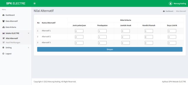 - Melakukan penilaian alternatif dari masing-masing kriteria yang nantinya akan digunakan untuk perhitungan metode electre.