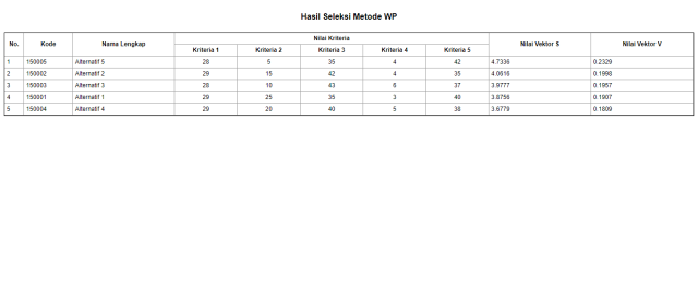 Pada kasus ini hasil akhir yang diperoleh adalah alternatif dengn vektor V tertinggi, yaitu alternatif yang mendapatkan skor (Nilai Preferensi) tertinggi.