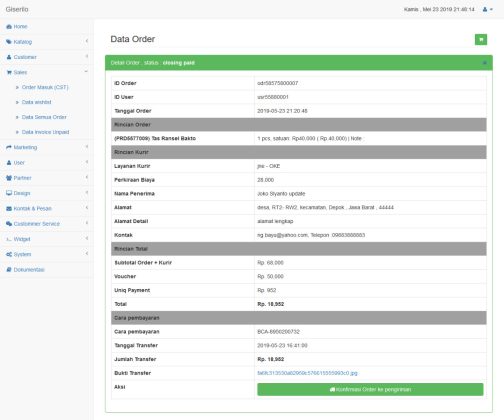 - Support E-mail reminder, E-mail Konfirmasi registrasi / reset password, E-mail Konfirmasi order