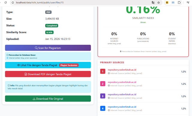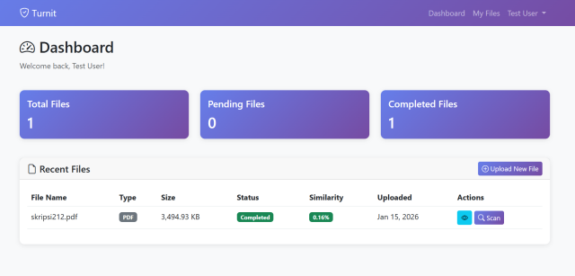 Turnitin-Like Plagiarism Detection System adalah aplikasi web berbasis Laravel 10 yang berfungsi sebagai sistem deteksi plagiarisme profesional, mirip dengan Turnitin. Aplikasi ini dirancang khusus untuk institusi pendidikan, universitas, dosen, dan mahasiswa yang membutuhkan tools untuk mengecek keaslian dokumen akademik.