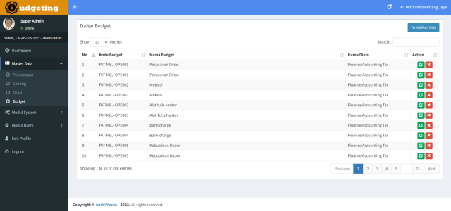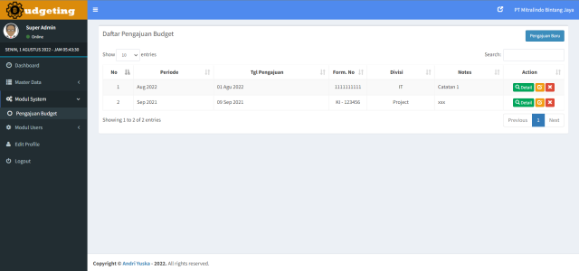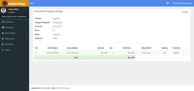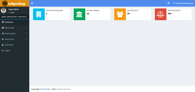 Merupakan aplikasi yang mencatat pengajuan budget masing-masing perusahaan dan masing-masing cabang serta masing-masing divisi.