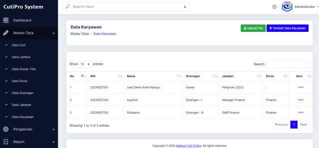 A: Anda dapat mencoba demo CutiPro 2.0 melalui link berikut: https://hris.kreasimart.com/