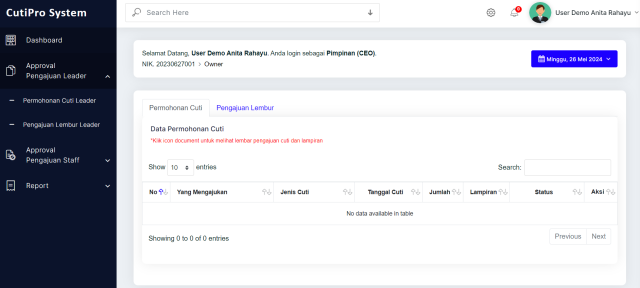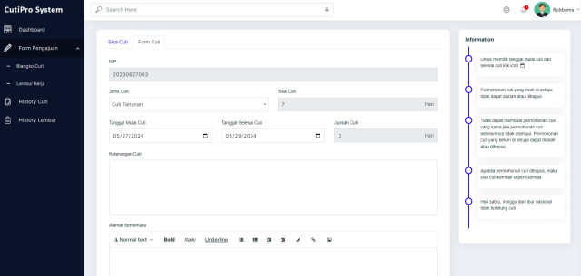 CutiPro 2.0 adalah aplikasi manajemen cuti dan lembur karyawan berbasis web yang dirancang untuk menyederhanakan pengelolaan administrasi SDM di perusahaan Anda. Dengan dukungan real-time tracking dan approval berjenjang, aplikasi ini memberikan solusi otomatisasi yang efisien, cepat, dan akurat untuk setiap proses cuti maupun lembur.