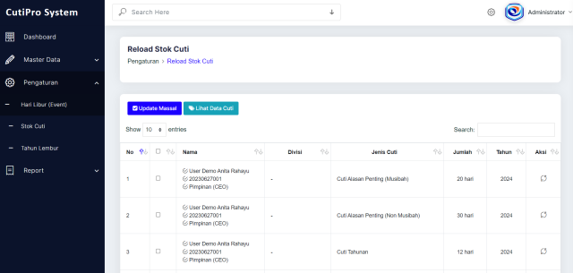• Reload stok cuti (update per karyawan / update massal)