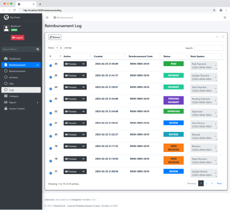Dengan fitur manajemen kategori, riwayat revisi, pencatatan log status reimbursement, ReimTrack memastikan setiap klaim dapat diproses dengan transparan.