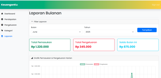 - **Dashboard**: Ringkasan finansial (total pemasukan, pengeluaran, dan saldo).