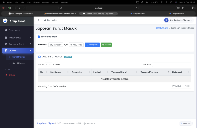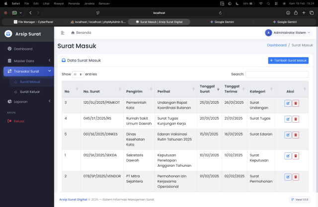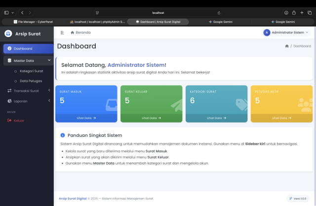 Dashboard Interaktif: Menampilkan ringkasan statistik total surat masuk, surat keluar, dan kategori dalam bentuk Card yang menarik.