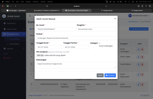 Kategori Surat Dinamis: Master data untuk mengatur jenis surat (Undangan, Edaran, Penting, Rahasia, dll).