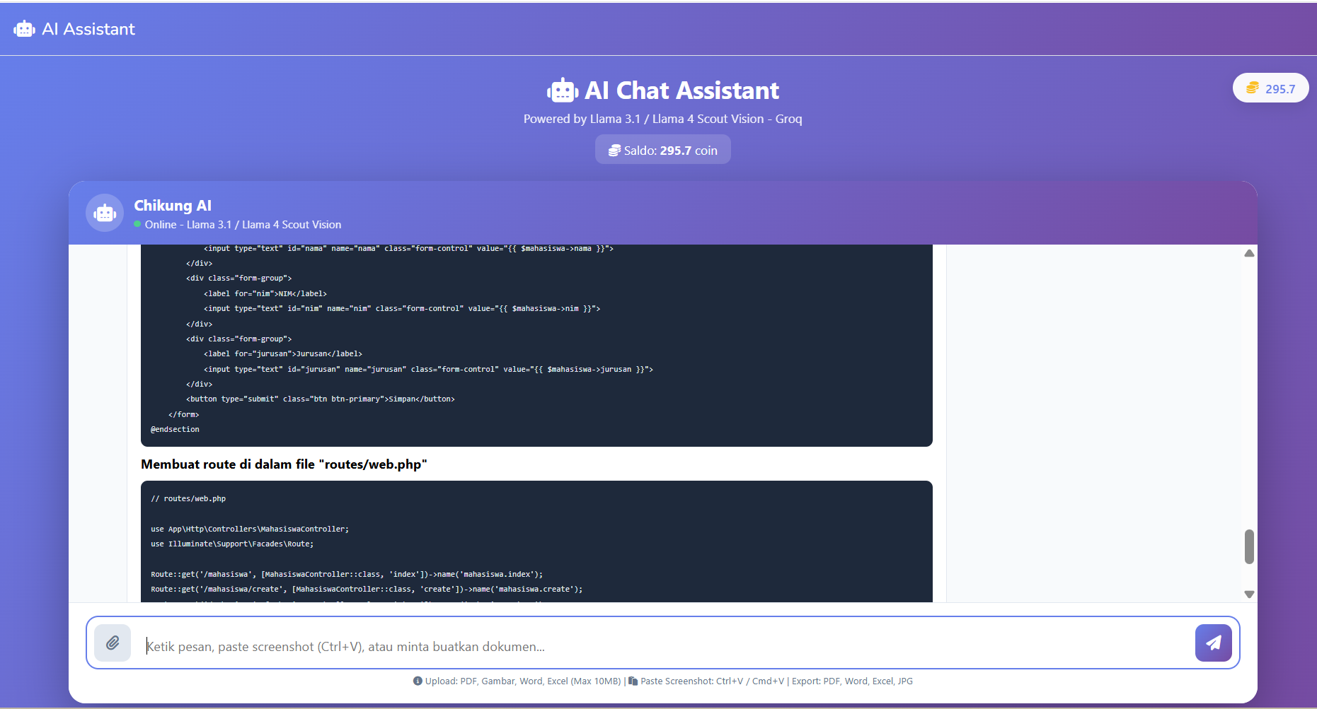 ? Coding Expert: Generate/Perbaiki Code Web (PHP, JS, dll) & Android (Java/Kotlin). ? Akademik: Cek Orisinalitas Turnitin untuk Skripsi & Tugas. ? Google Review: Membantu review produk/tempat secara cerdas. ? File Processor: Kirim file dokumen/code, biarkan AI menganalisisnya.