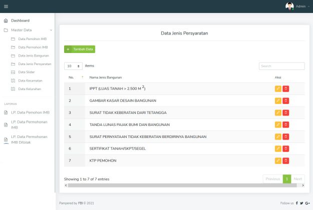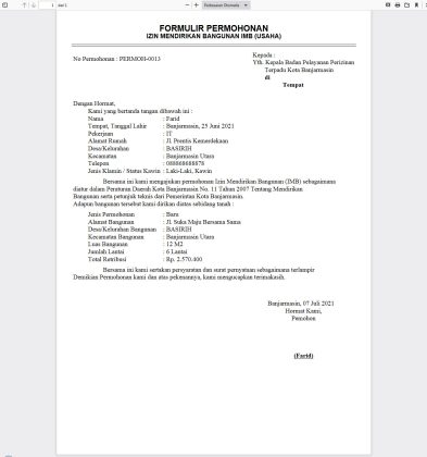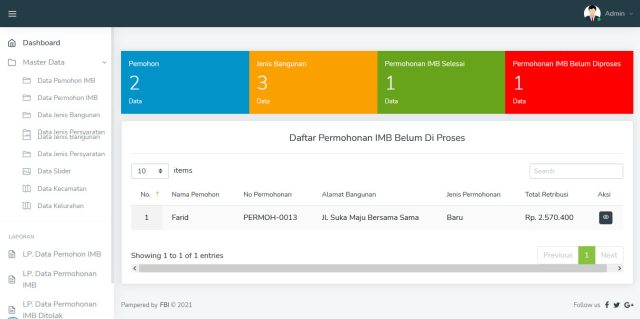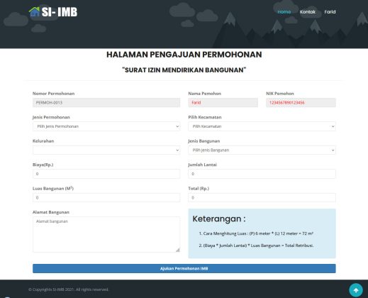 Sistem Informasi Izin Mendirikan Bangunan (IMB) Berbasis Website ini adalah sistem yang dapat memudahkan dalam proses permohonan surat izin mendirikan bangunan (IMB) baik itu untuk bangunan usaha atuapun tempat tinggal dan sistem informasi ini jug dapat dikembangkan lagi karena sistem ini hanya menggunkan PHP Native.