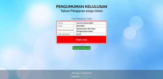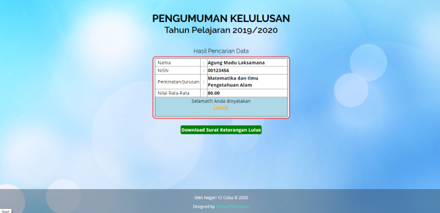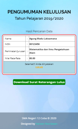 Source code ini dibuat untuk memudahkan sekolah dalam memberikan pengumuman secara Online terhadap peserta didik. Dengan harapan peserta didik tidak Konvoi motor lagi apabila pengumuman dilakukan seara Online.