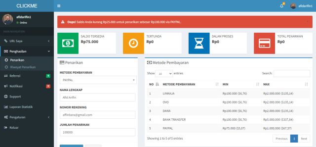 2. Penghasilan (Withdraw, dan Riwayat Withdraw).