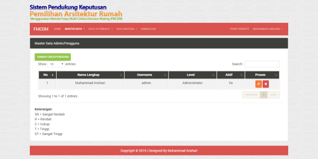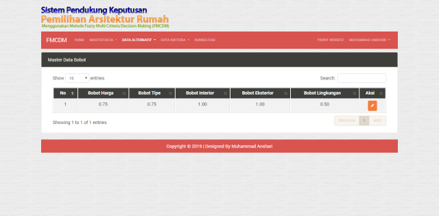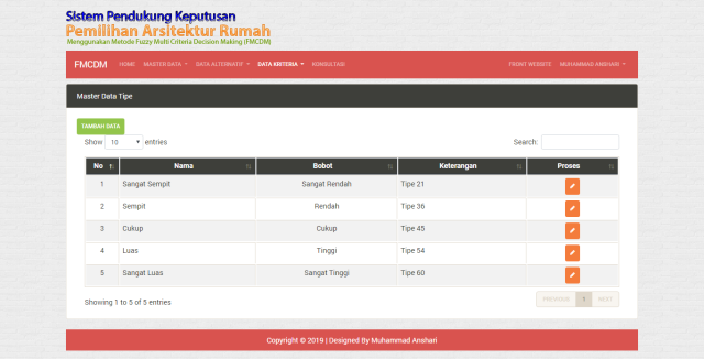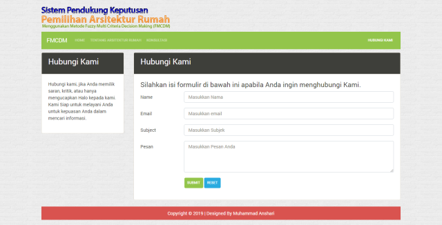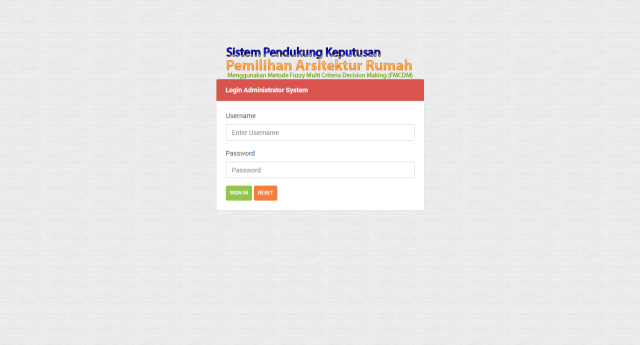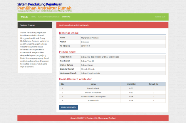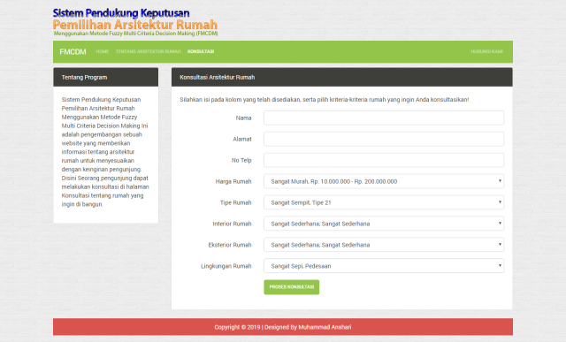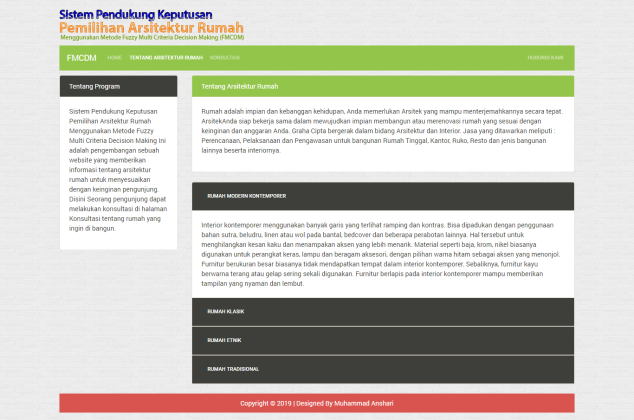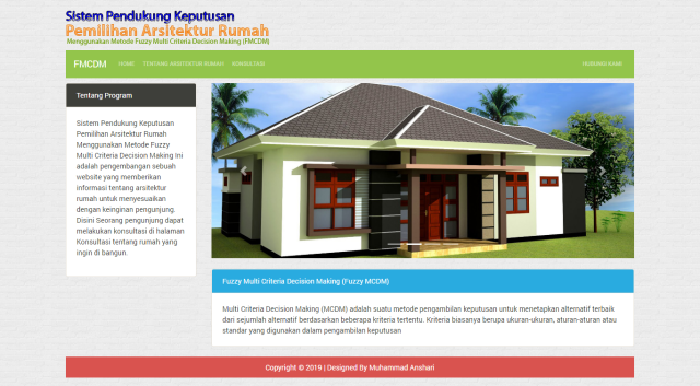 Sistem Pendukung Keputusan Pemilihan Arsitektur Rumah Menggunakan Metode Fuzzy Multi Criteria Decision Making Ini adalah pengembangan sebuah website yang memberikan informasi tentang arsitektur rumah untuk menyesuaikan dengan keinginan pengunjung. Disini Seorang pengunjung dapat melakukan konsultasi di halaman Konsultasi tentang rumah yang ingin di bangun.