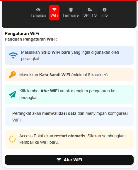 WiFi Management: Set SSID & password, restart otomatis.