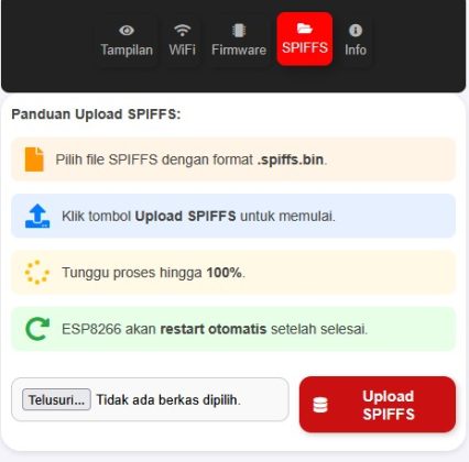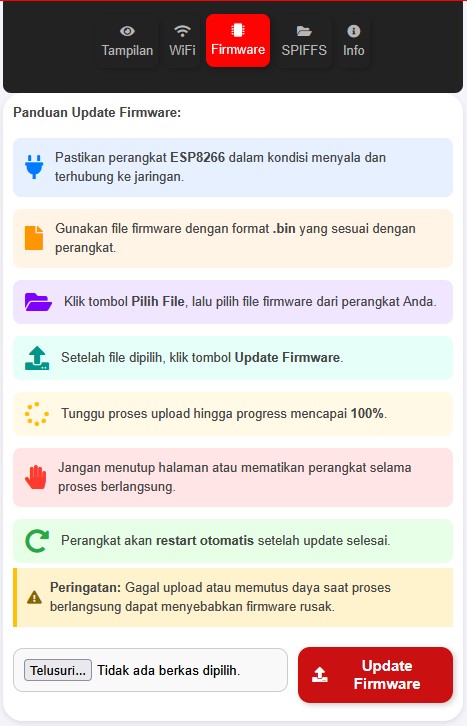 Firmware Update Mudah: Upload .bin & file SPIFFS dengan progress real-time.