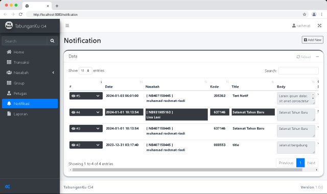 Fitur untuk mengirim pemberitahuan kepada Nasabah. Notifikasi hanya akan dikirimkan / ada pada Web Panel Ibank Nasabah.