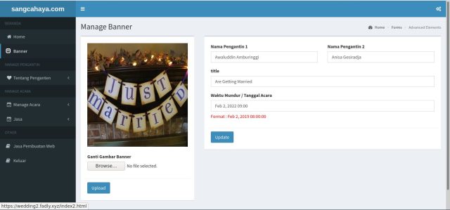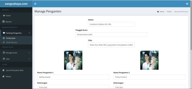 dengan web wedding ini, sudah terdapat backend nya juga, jadi semua konten-konten nya bisa kita ubah secara dinamis, bisa kita ubah langsung melalui backend nya..
