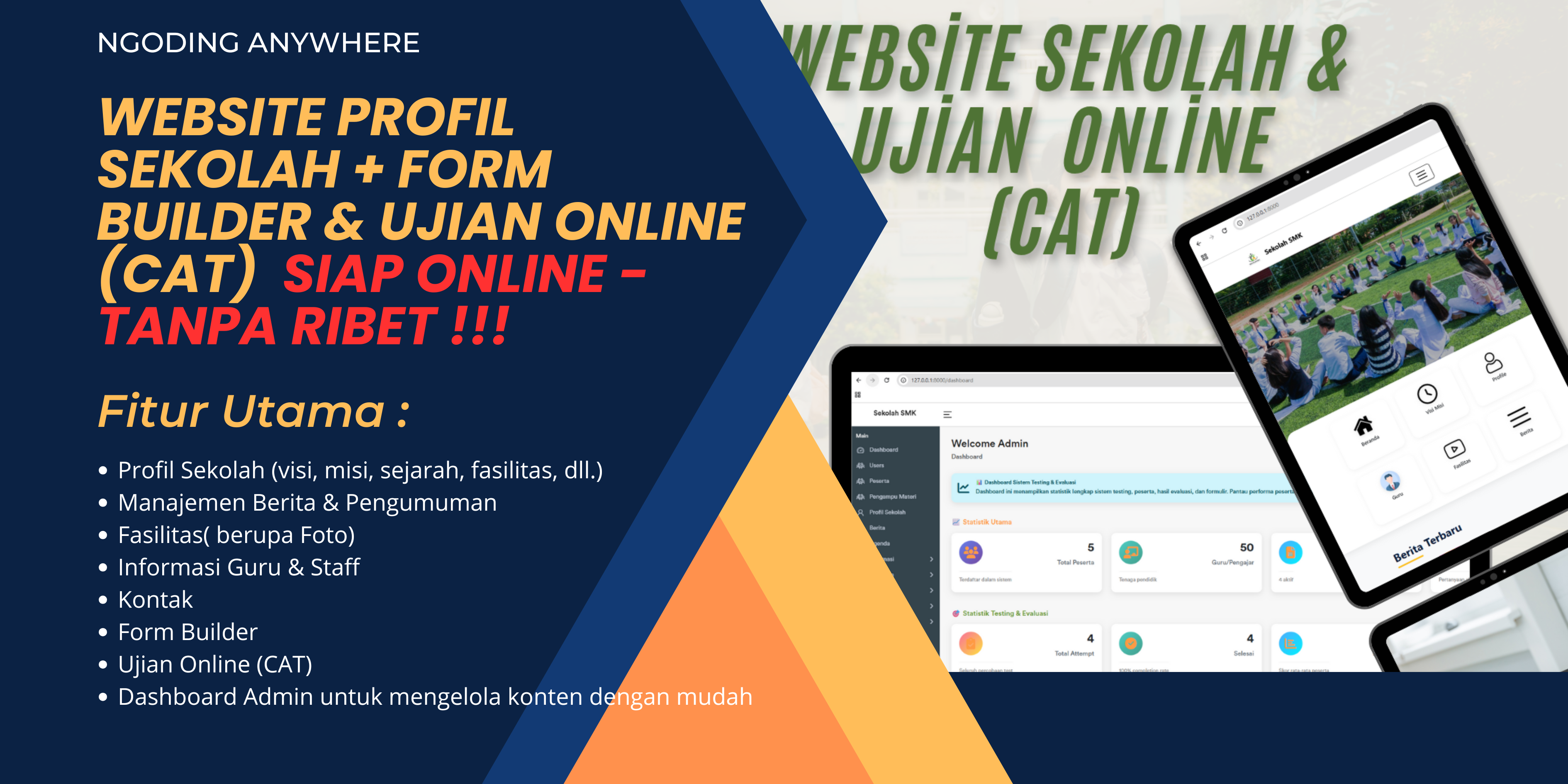 Fitur andalan: form builder drag-and-drop (mirip Google Form) untuk pendaftaran / survei, sistem ujian CAT lengkap (timer, pengacakan soal/opsi, bobot soal, penghitungan skor otomatis), manajemen pengguna (admin, guru, peserta), laporan hasil ujian, impor/ekspor data, serta mengatur penamaan menu.