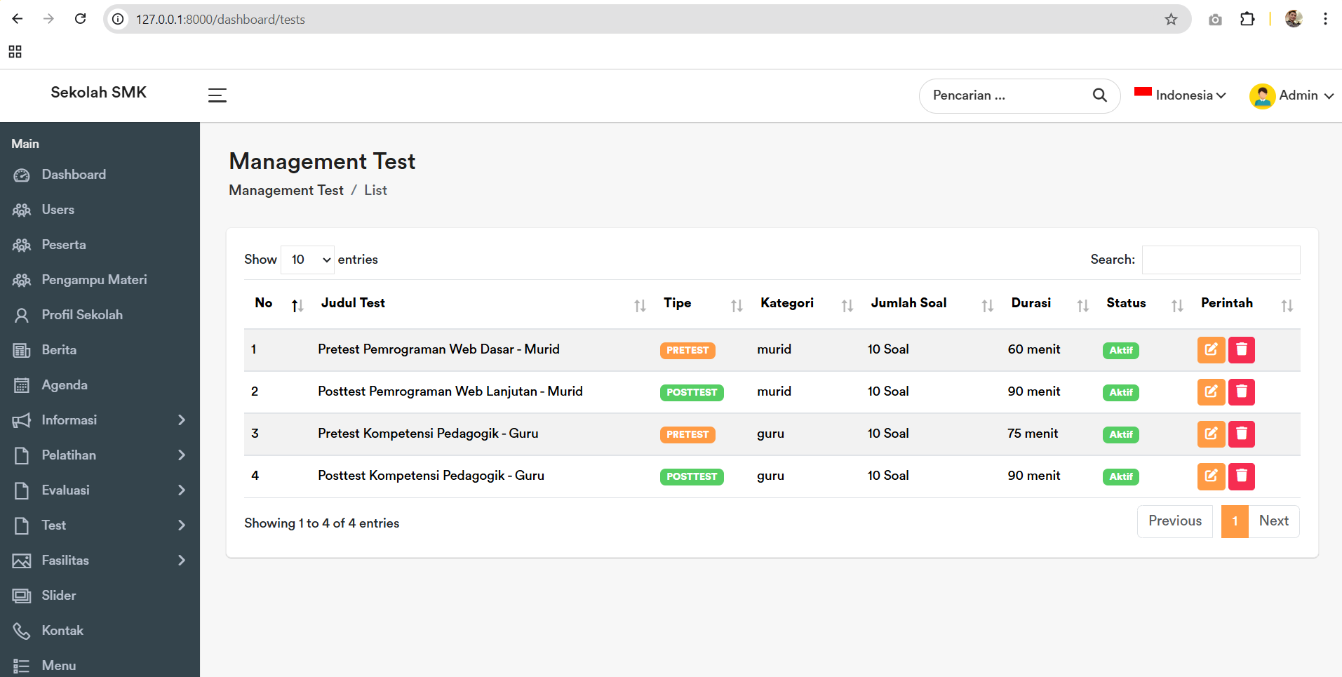 3. Dashboard Admin : kelola pengguna, soal, ujian, hasil, dan statistik.