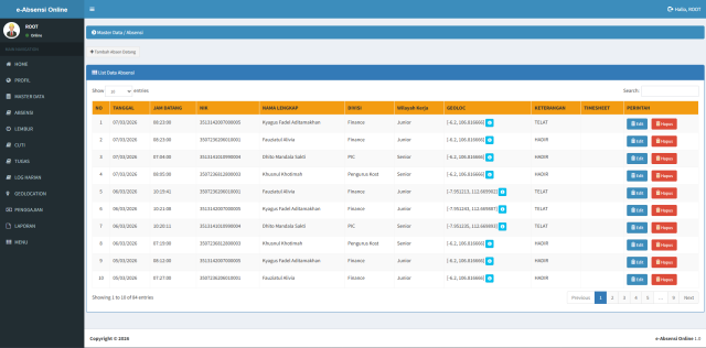 Sistem ini memungkinkan karyawan melakukan absensi melalui web maupun aplikasi Android, dengan pencatatan lokasi otomatis menggunakan GPS sehingga meminimalisir kecurangan absensi.